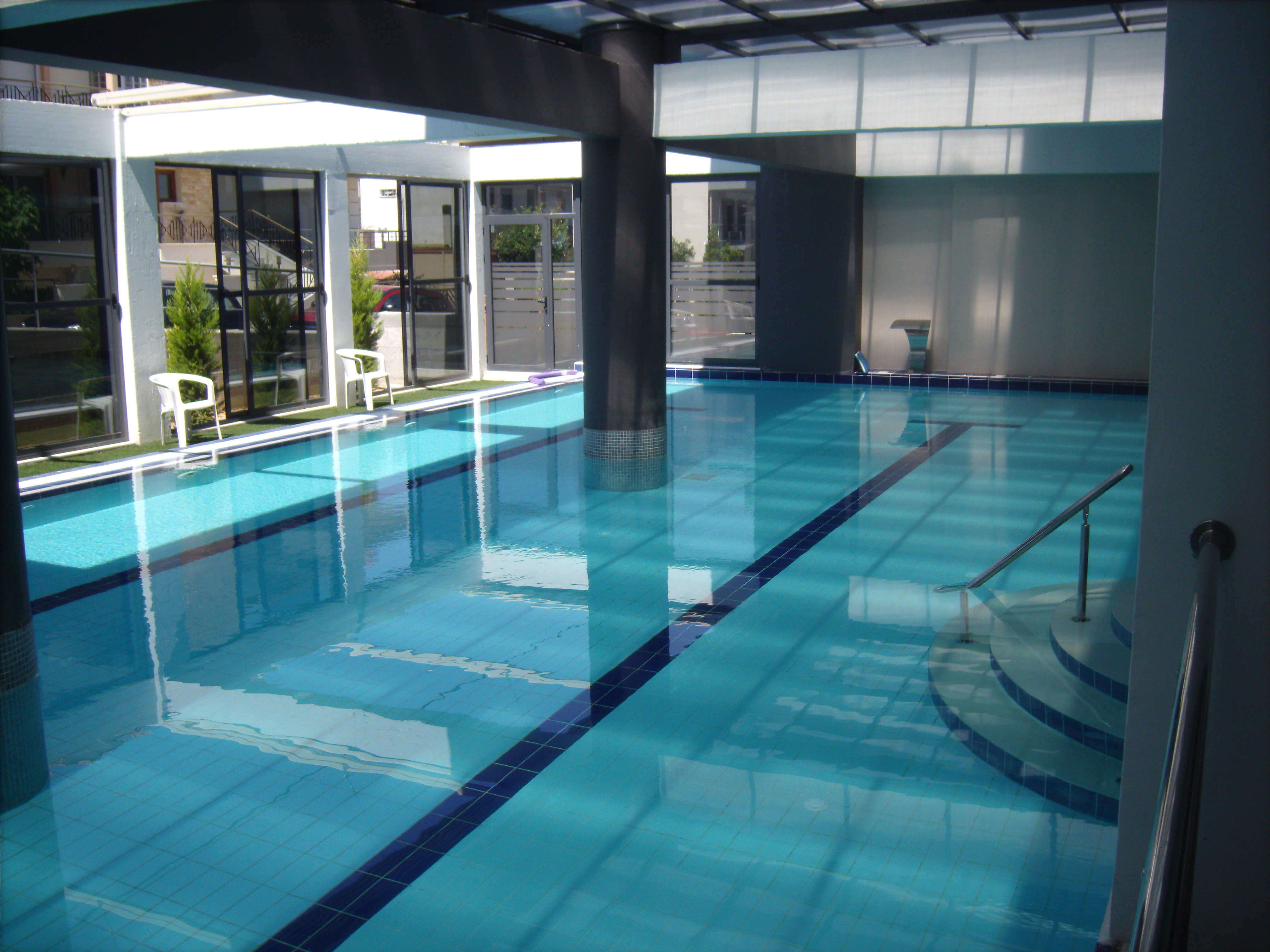 Εσωτερική πισίνας διατάσεων 20Χ8m. Θερμαινόμενη με αυτόματο σύστημα μέτρησης - ρύθμισης ΡΗ και Χλωρίου. Με γεννήτρια όζοντος για την αποφυγή των οσμών των παράγωγων του χλωρίου