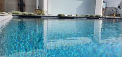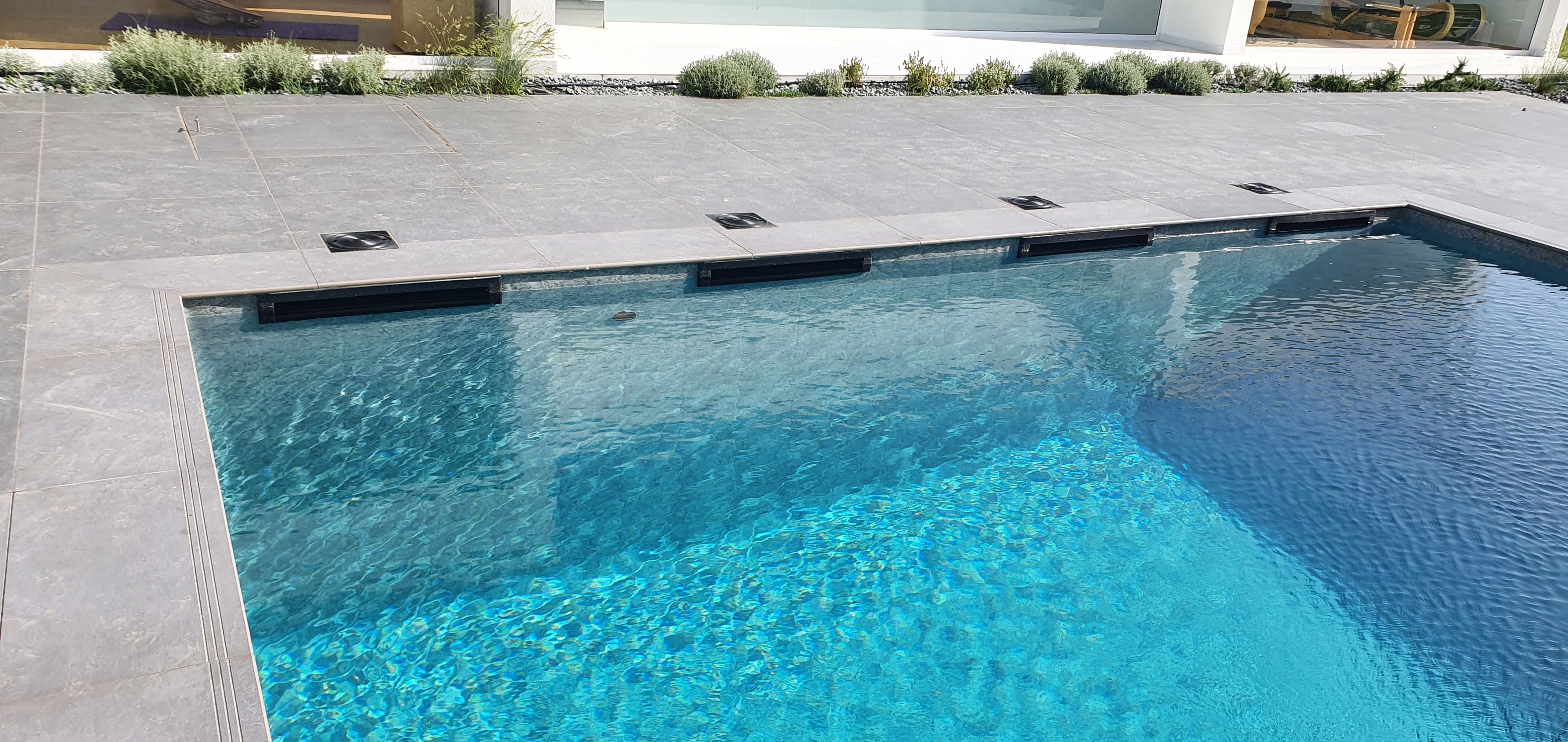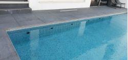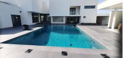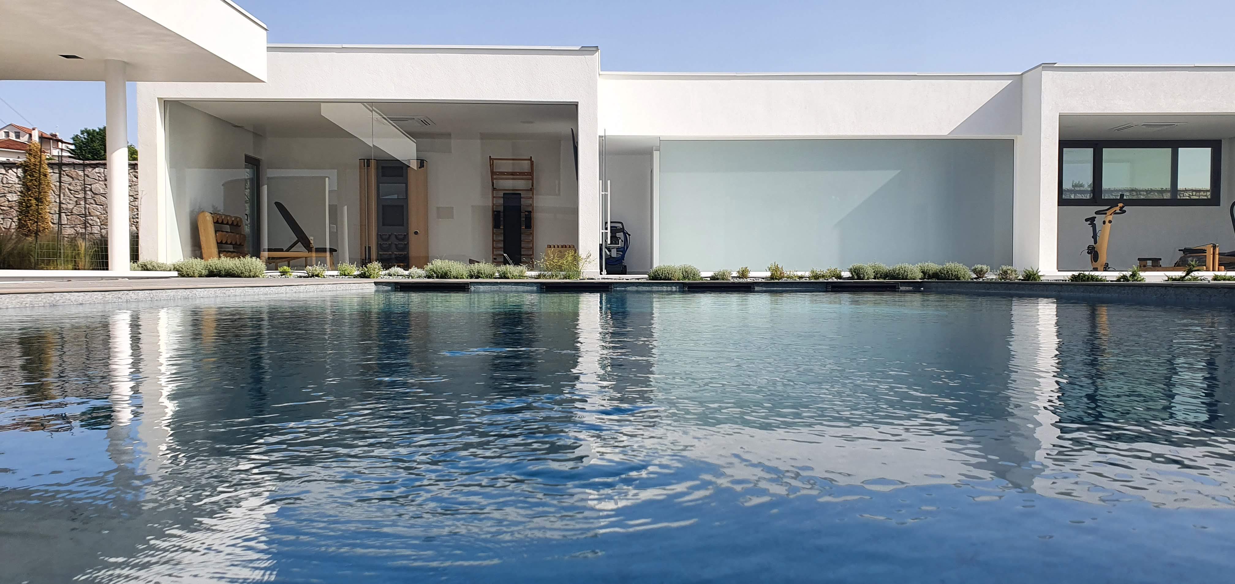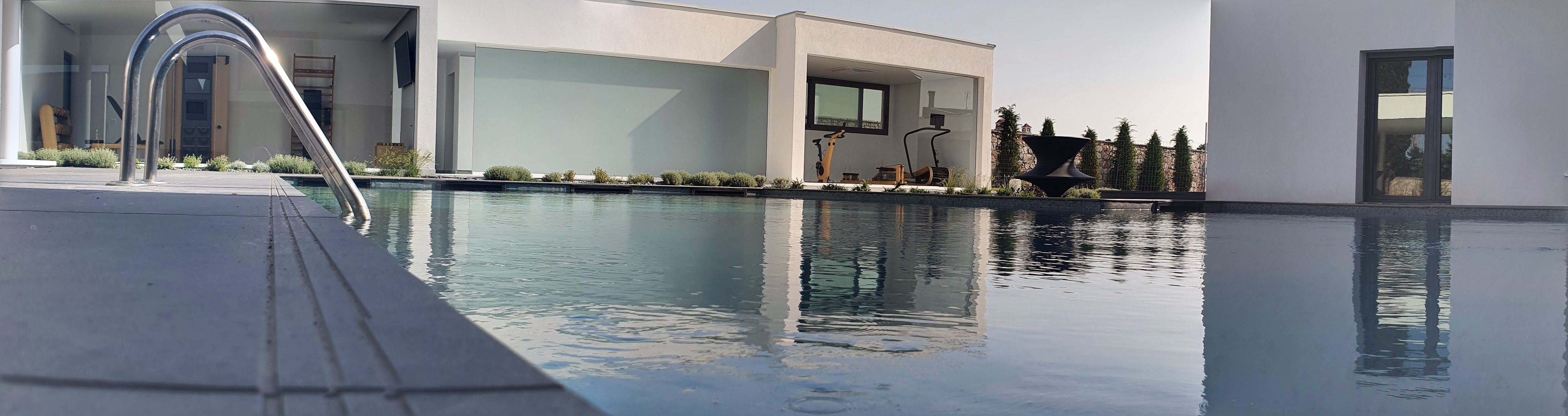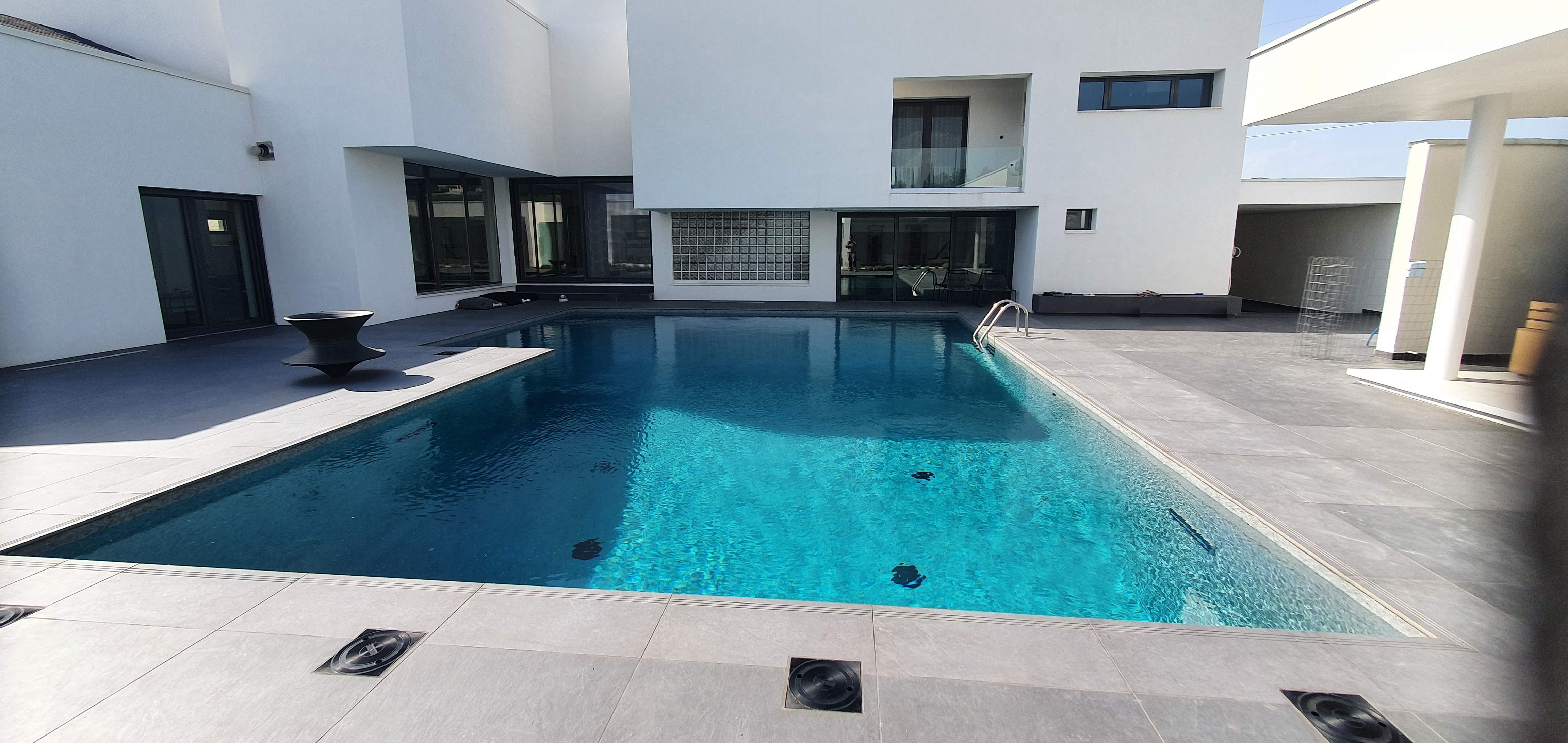 Η πισίνα είχε πλακάκι κλασικό χρώματος γαλάζιου και λευκά εξαρτήματα . Αντικαταστάθηκαν όλα τα εξαρτήματα σε φλαντζωτά και μαύρου χρώματος. Η πισίνα επενδύθηκε με μεμβράνη ΤOUCH γκρι απόχρωσης. Τοποθετήθηκε σύστημα ηλεκτρόλυσης και αυτόματος έλεγχος του ΡΗ και του Χλωρίου. Ο έλεγχος των λειτουργιών της πισίνας γίνεται με εφαρμογή σε smartphone ή tablet.